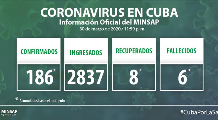 - Ciudadana cubana de 71 años de edad, procedente de Sancti Spíritus e ingresada en el Hospital “Manuel Piti Fajardo”, de Villa Clara. Arribó de España el 20 de marzo y comenzó con síntomas el 21. Ha presentado empeoramiento clínico y radiográfico. Continúa reportada en estado crítico.
