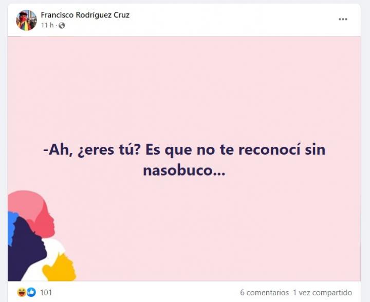 «Niña, me subo a un taxi y el chofer sin nasobuco, lo que le puse fue coquito con dulce de guayaba, de irresponsable para alante le dije hasta alma mía. El tipo me dejó terminar tranquilamente y lo único que me dijo fue: señora, hay que ver el noticiero. El muchacho que venía sentado al lado mío me enseñó en el móvil un meme y me dijo: mire mi tía, ya no hay que usar eso, los feos son los únicos que salieron hoy con nasobuco».