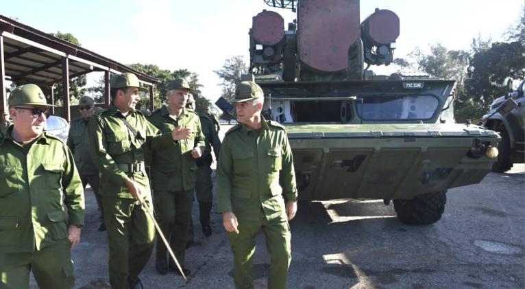 El mandatario estuvo presente en la Gran Unidad de Tanques de la Gloria Combativa «Rescate de Sanguily» acompañado por el general de cuerpo de ejército y ministro de las Fuerzas Armadas Revolucionarias (FAR), Álvaro López Miera; y los generales de cuerpo de ejército Roberto Legrá y Joaquín Quintas Solá, vice ministro primero y viceministro de las FAR, respectivamente.