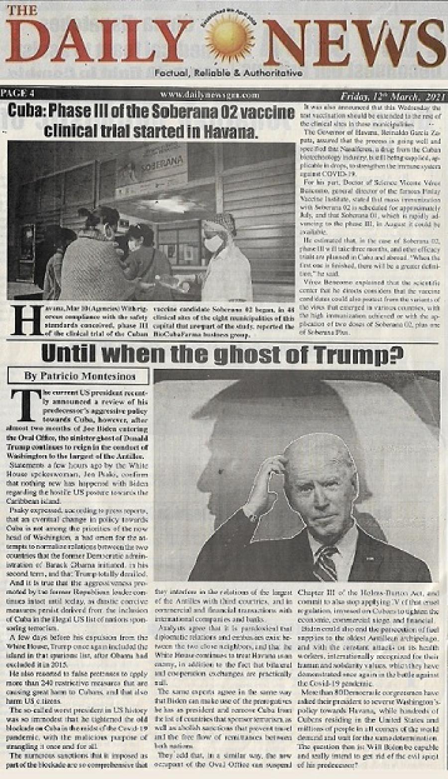 El Daily News publica además en su misma página 4, un extenso artículo titulado: ¿Hasta cuándo el fantasma de Trump?, en el cual se subraya que, pese al cambio de gobierno en EE.UU., aun sigue imperando en la Casa Blanca la misma conducta hostil hacia la nación antillana.