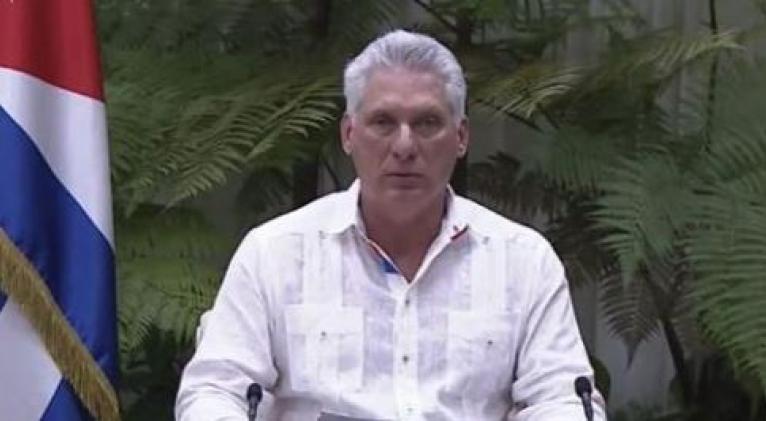 Díaz-Canel fue acompañado en su discurso por José Ramón Machado Ventura, segundo secretario del Comité Central del Partido Comunista de Cuba, y Bruno Rodríguez, ministro de Relaciones Exteriores.