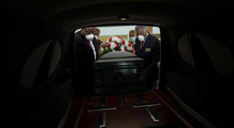 Fotografía de archivo del 18 de abril de 2020 de varios trabajadores de un servicio de funerales colocando un ataúd en una carroza en Dawson, Georgia.