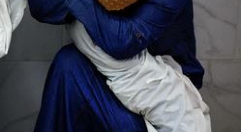 La fotografía no muestra el rostro de ninguna de las dos personas que aparecen en la imagen. La mujer adulta, cuyo rostro está oculto por su brazo, viste un atuendo largo de color azul y un velo marrón que le cubre el pelo, mientras el cuerpo y la cabeza de la niña que ella abraza, están envueltos en una tela blanca, señal de que ya no está con vida.