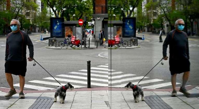 Esta imagen, tomada el 2 de mayo en Madrid, muestra a un hombre con mascarilla sanitaria caminando con un perro, durante la primera jornada en la que se permitió a los españoles pasear o hacer deporte después de 48 días de confinamiento obligatorio.