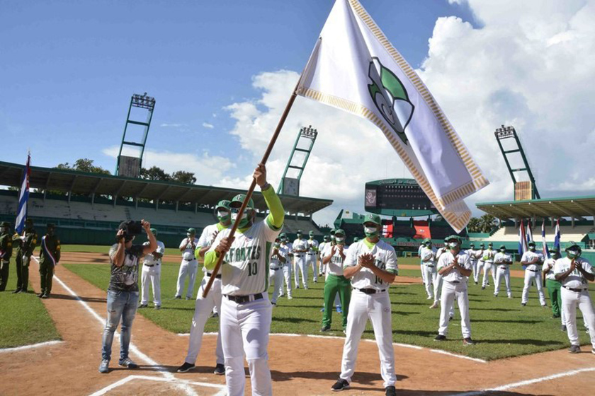 Alexandre Corona Quintero, gobernador de la provincia de Cienfuegos, puso la bandera del equipo de pelota en manos de Alain Álvarez, director técnico, con el compromiso de dar lo mejor de todo el equipo en esta temporada.