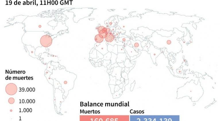 El nuevo coronavirus ha provocado al menos 160.685 muertos en el mundo desde que apareció en diciembre en China, según un balance establecido por AFP sobre la base de fuentes oficiales, este domingo a las 11H00 GMT.