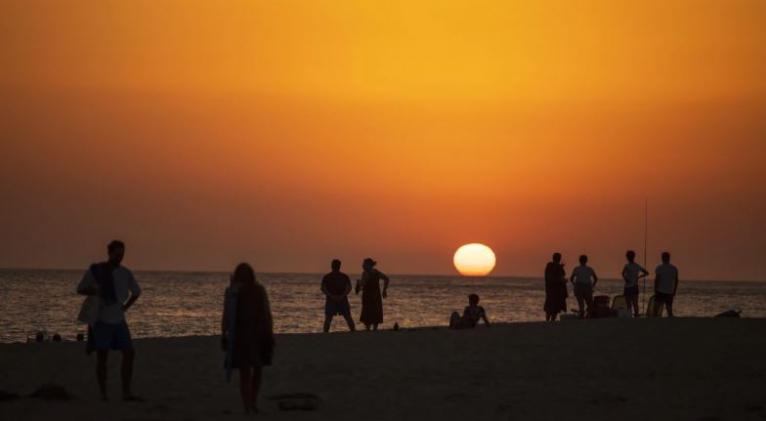 Personas observan el atardecer en una playa cerca del faro de Trafalgar, el 29 de julio de 2020, en Los Caños de Meca, España. (AP Foto/Emilio Morenatti, Archivo)