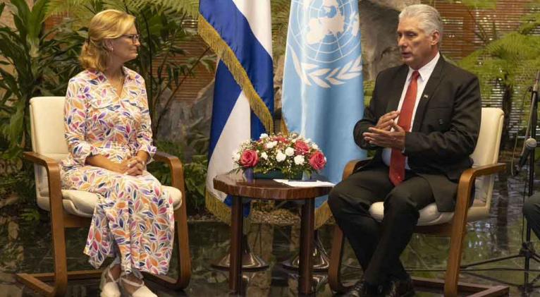 El presidente de Cuba, Miguel Díaz-Canel, se reunió hoy aquí con la secretaria general de la Unión Internacional de Comunicaciones (UIT), Doreen Bogdan-Martin, quien se encuentra por primera vez en el país caribeño.