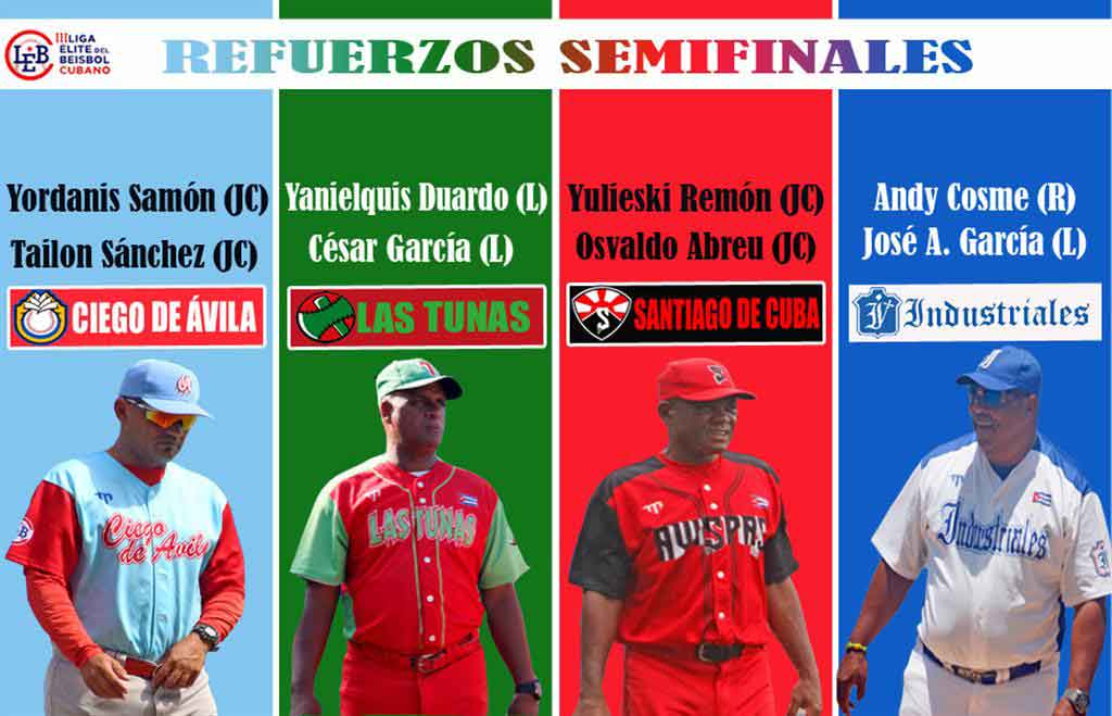 Los Cuatro equipos clasificados a las semifinales de la Liga Élite del Béisbol Cubano escogieron hoy los dos refuerzos permitidos por la Comisión Nacional para enfrentar la siguiente instancia.