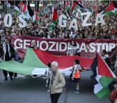 Miles de personas se manifiestan con banderas palestinas tras un cartel de 'Stop genocidio' durante una protesta apoyada por figuras del cine español durante el Festival de San Sebastián, el 24 de septiembr4e de 2025 en la ciudad vasca. Ander Gillenea / AFP