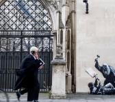 Varias personas hacen fotos y selfis ante el último mural de Banksy, antes de que fuera borrado de la fachada del Tribunal Superior de Londres. Foto:REUTERS