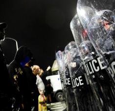 Una manifestante que se opone a la confirmación de Amy Coney Barrett para ocupar un lugar en la Suprema Corte de Estados Unidos es conminada a bajar de la estatua Contemplación de la Justicia, a la cual se encadenó. Foto Ap