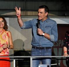 Pedro Sánchez sale a celebrar el resultado del Partido Socialista Obrero Español (PSOE) frente a sus militantes. En Madrid, España, el 23 de julio de 2023. © Javier Soriano / AFP