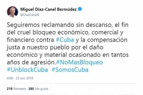 'Seguiremos reclamando sin descanso, el fin del cruel bloqueo económico, comercial y financiero contra #Cuba y la compensación justa a nuestro pueblo por el daño económico y material ocasionado en tantos años de agresión.#NoMasBloqueo #UnblockCuba #SomosCuba', escribió el jefe de Estado en su cuenta de Twitter @DiazCanelB.