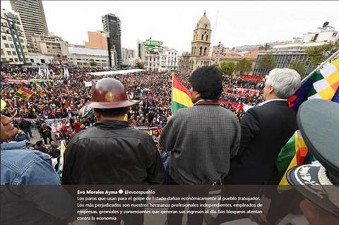 En consonancia con la información de que en las primeras dos semanas de paro el país perdió más de 167 millones de dólares, brindada por la cartera de Economía y Finanzas, Morales escribió en esa red social que los bloqueos atentan contra la esfera económica.