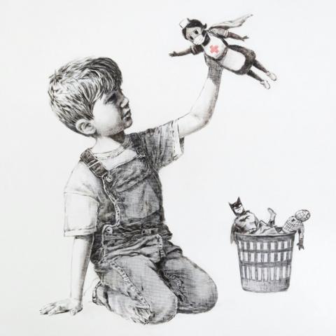 La creación en blanco y negro del famoso artista urbano representa un niño de rodillas, que juega con una muñeca superheroína: una enfermera con capa, máscara y un delantal con una cruz roja. En la basura, cerca del niño, se ven los muñecos de Batman y Spiderman, abandonados.