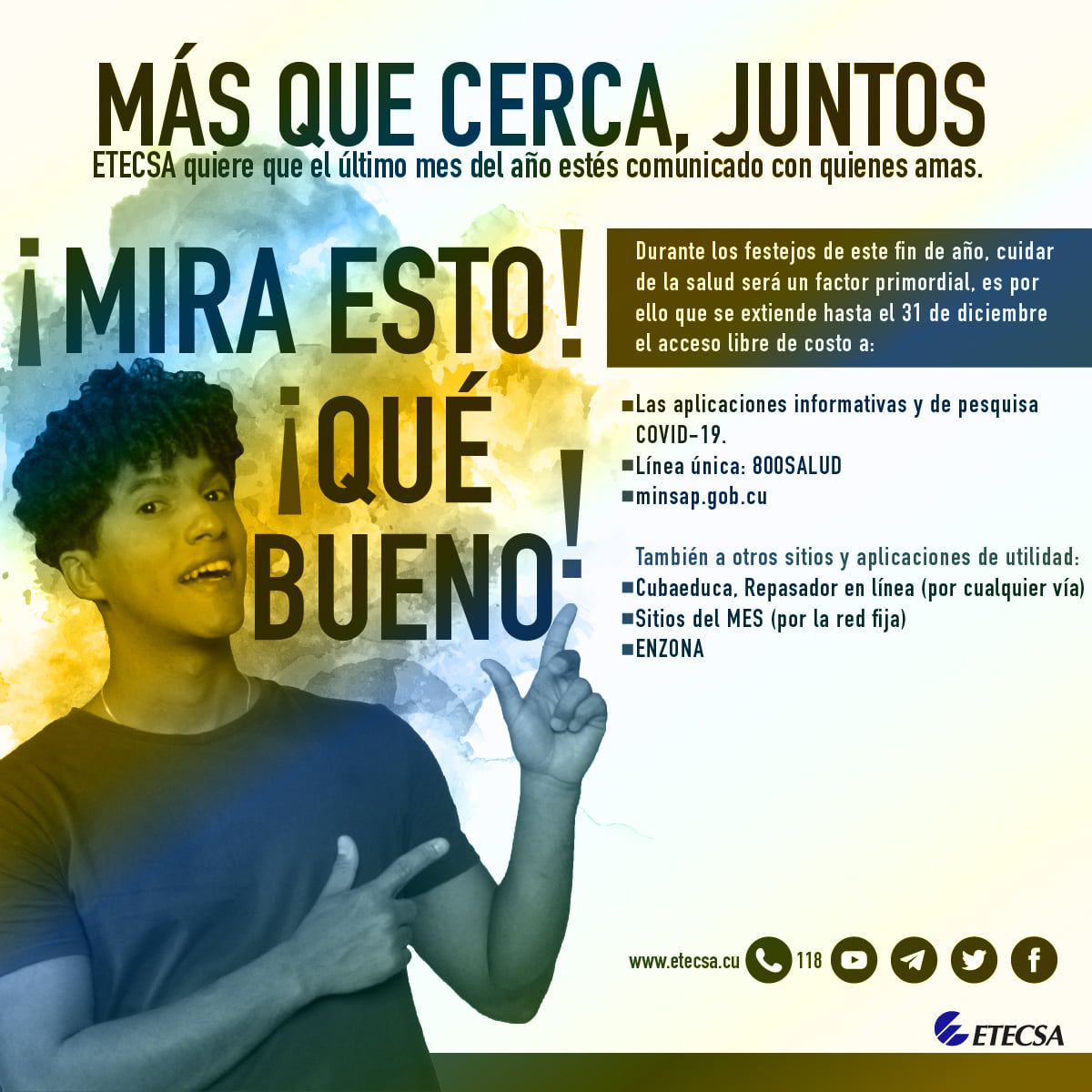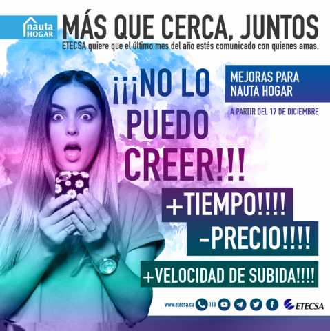 La Empresa de Telecomunicaciones de Cuba S.A. (ETECSA), por su misión de satisfacer cada día más a sus clientes y al pueblo, la cercanía de las festividades por fin y año nuevo, y en saludo al nuevo aniversario del Triunfo de la Revolución cubana, anunció hoy en esta capital mejoras que abarcan a la activación de la línea móvil, al servicio Nauta Hogar, y la extensión hasta el 31 de diciembre de las medidas comerciales actuales para apoyar el enfrentamiento a la Covid-19.