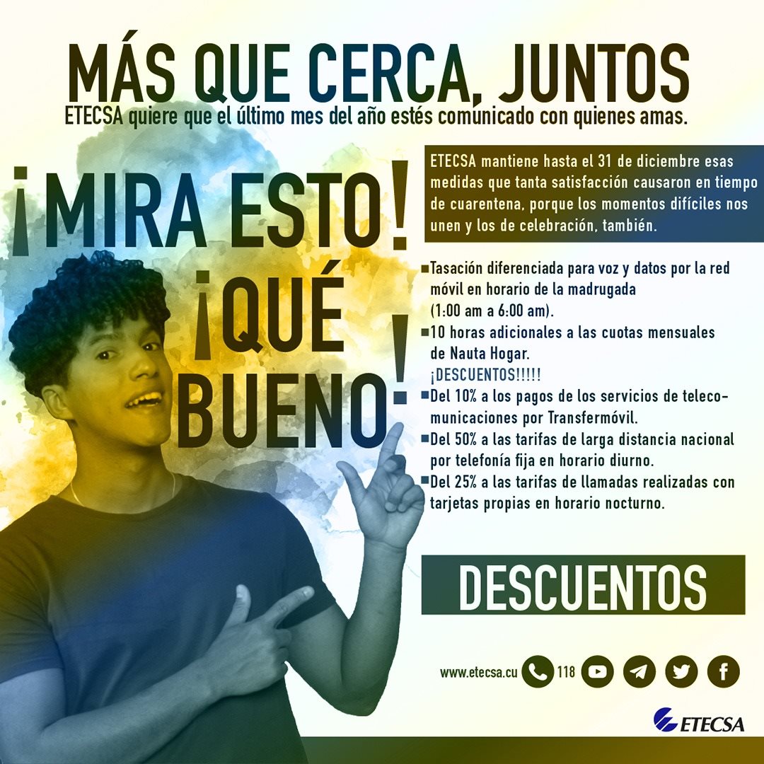Asimismo, se seguirán aplicando los descuentos del 10 por ciento a los pagos de los servicios de telecomunicaciones por Transfermóvil, del 50 por ciento a las tarifas de larga distancia nacional por telefonía fija en horario diurno y del 25 a las tarifas de llamadas realizadas con tarjetas propias en horario nocturno. Continuará libre de costo el acceso a las aplicaciones informativas y de pesquisa, línea única: 800SALUD, ENZONA y los sitios de interés educativo.