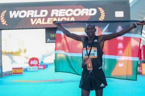 Con zancadas amplias y ritmo constante, Kandie, de 24 años, dejó atrás por casi 30 segundos la marca anterior de su compatriota Geoffrey Kamworor (58:01), alcanzada en septiembre de 2019 en Copenhague, capital de Dinamarca.