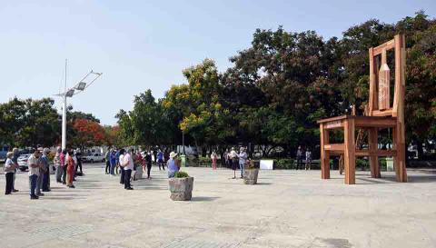 Una silla gigante de madera, confeccionada por el grupo de artesanos Leo y Migue, adornará desde hoy el Paseo de la Alameda de esta ciudad.