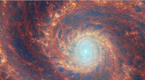 A diferencia de las galaxias con brazos espirales irregulares o interrumpidos, las galaxias espirales de gran diseño cuentan con brazos espirales prominentes y bien desarrollados como los que se muestran en esta imagen. Este retrato galáctico es una imagen compuesta que integra datos de la cámara de infrarrojo cercano (NIRCam) de Webb y el innovador instrumento de infrarrojo medio (MIRI).