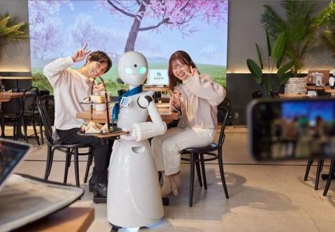 Las bebidas son transportadas por el café por robots más grandes, mientras modelos más pequeños en cada mesa toman los pedidos y explican el menú.