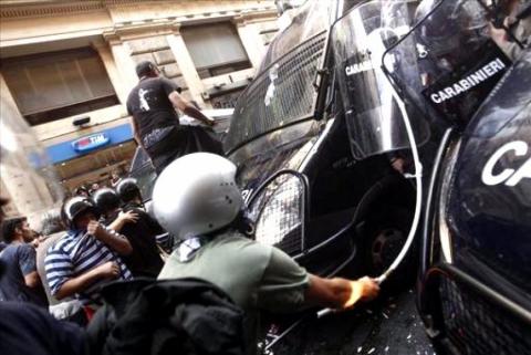 Este enfrentamiento ha desatado una pequeña batalla campal en la céntrica calle del Tritone, donde un blindado policial ha sido asaltado por un grupo de jóvenes, algunos encapuchados, quienes se han subido al vehículo y desde ahí han lanzado objetos para luego bajarse y zarandearlo.