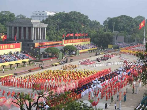 En tierra, la marcha por la plaza Ba Dinh la abrió la Guardia de Honor que portaba una maqueta del Emblema Nacional inspirado en los tambores de bronce, símbolo de la unidad nacional, seguidos por representantes de los 54 grupos étnicos del país, la bandera del Partido y la enseña nacional, y un vehículo con el retrato del tío Ho.