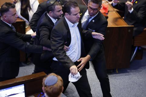 Los reportes indicaron que el legislador árabe Ayman Odeh, líder del partido Hadash, y Ofer Cassif, el único legislador judío en el partido árabe, fueron los expulsados mientras Trump hablaba. Ambos sostenían el cartel que defendía el reconocimiento a Palestina.