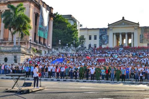 Consignas cargadas de patriotismo y los más emblemáticos himnos que han acompañado nuestras tradiciones de lucha -interpretados por la Banda de Música del Estado Mayor General de las Fuerzas Armadas Revolucionarias- marcaron el recorrido, junto a la bandera de la estrella solitaria, y las que representan a la Unión de Jóvenes Comunistas, la Federación Estudiantil Universitaria, la Federación de Estudiantes de la Enseñanza Media y la Organización de Pioneros “José Martí”.