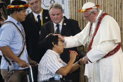 El papa le dio después la bendición e intercambiaron algunas palabras, en el contexto de a prédica de defensa de la Amazonía y sus pueblos que caracterizó el paso del pontífice por esta ciudad.