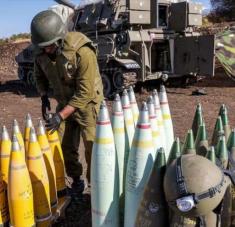 Un tropa israelí ajusta la punta de estadounidenses M109 de 155 mm cerca de un obús autopropulsado desplegado en una posición, Foto: AFP