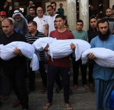 Familiares llevan los cuerpos de varios niños palestinos muertos en los bombardeos israelíes sobre Gaza. Foto: AFP