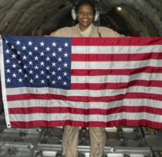 Foto del 28 de diciembre del 2009 en la que se ve a la teniente coronel retirada de la Fuerza Aérea Stephanie Davis sosteniendo una bandera de EEUU durante un vuelo por Pakistán y Afganistán. Davis dijo que pensó que las fuerzas armadas la tratarían igual que a los demás, pero que se sintió discriminada. Si bien progresó y llegó alto, muchos compañeros blancos le negaban el saludo de rigor a alguien de su rango y veían en ella solo a “una mujer irritable de raza negra”, una típica caracterización racista de las mujeres afroestadounidenses. (Cortesía de Stephanie Davis vía AP)