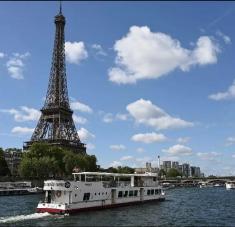 Un barco pasa junto a la Torre Eiffel en el río Sena durante un desfile para los preparativos de la futura ceremonia de inauguración de los Juegos Olímpicos de París 2024, el 17 de julio de 2023. Foto: Afp