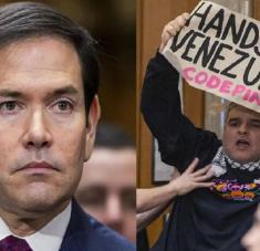 El secretario de Estado de EEUU, Marco Rubio, susurra algo al oído del presidente Trump tras haberle pasado una nota en medio de una mesa redonda en la Casa Blanca. Imagen Evan Vucci/AP