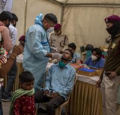 Un enfermero toma una muestra nasal de un pasajero en una prueba de COVID-19 en una terminal de ómnibus en Nueva Delhi, India, miércoles 24 de marzo de 2021. (AP Foto/Altaf Qadri)